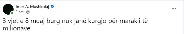 “3 vjet e 8 muaj nuk janë kugjo për marakli të milionave”, ka shkruar me ironi gazetari Mushkolaj.