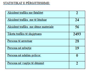 Sipas policisë, gjatë kësaj periudhe kohore janë evidentuar disa aksidente në trafikun rrugor, prej tyre dy kanë qenë me fatalitet, 24 aksidente me të lënduar, ndërsa 56 me dëme materiale.