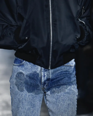 Xhinset je fundit të Jordanluca, të cilat debutuan në pistën vjeshtë/dimër 2023, shfaqin një njollë të errët në zonën e ijeve të pantallonave dhe kritikët thonë se duket sikur personi që i vesh ka urinuar.