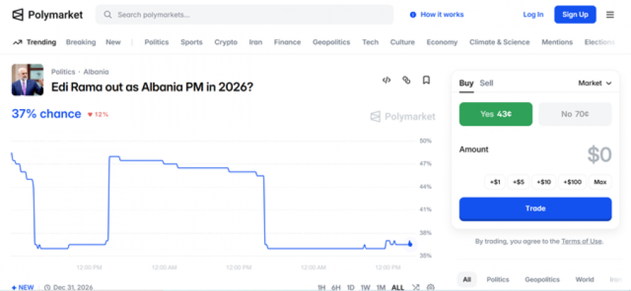 Qeveria shqiptare tashmë është bërë subjekt bastesh në tregjet globale. Në një nga platformat më të mëdha të parashikimeve, Polymarket, është hapur një pyetje që lidhet drejtpërdrejt me politikën shqiptare: “A do të largohet Edi Rama si kryeministër në vitin 2026?”