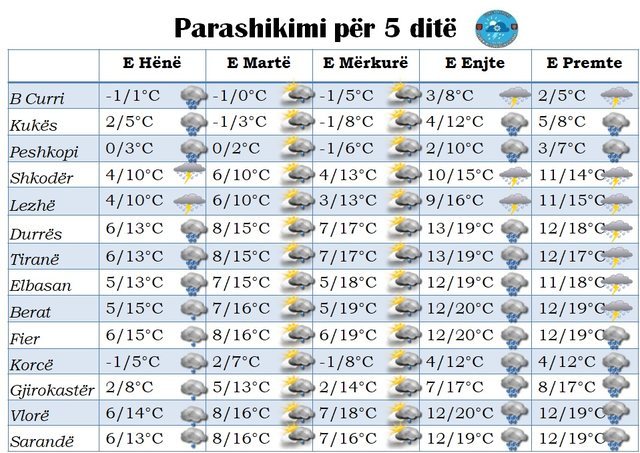 Në këtë mënyrë për ditët e hënë, ditën e enjte dhe atë të premte moti parashikohet me vranësira të dendura