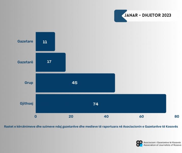 Asociacioni i Gazetarëve të Kosovës tha se në këtë fundvit ka numëruar 74 raste të kërcënimeve e sulmeve të raportuara nga gazetarët dhe mediat përgjatë periudhës kohore janar-dhjetor 2023.