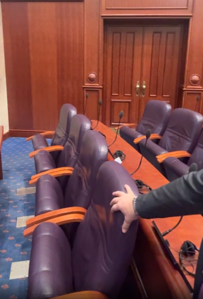 Paraprakisht, Grubi hyri në sallën e Kuvendit dhe tregoi karrigen ku do të uet kryeministri i parë shqiptar në RMV, Talat Xhaferi.