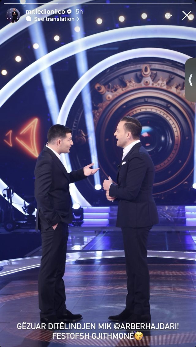 Mes urimeve të shumta nuk ka munguar as urimi i Ledion Liços, i cili e ka uruar me një foto nga ky edicion i BBV, ku Ledioni është moderator, ndërsa Arbëri opinionist për të tretin edicion radhazi.