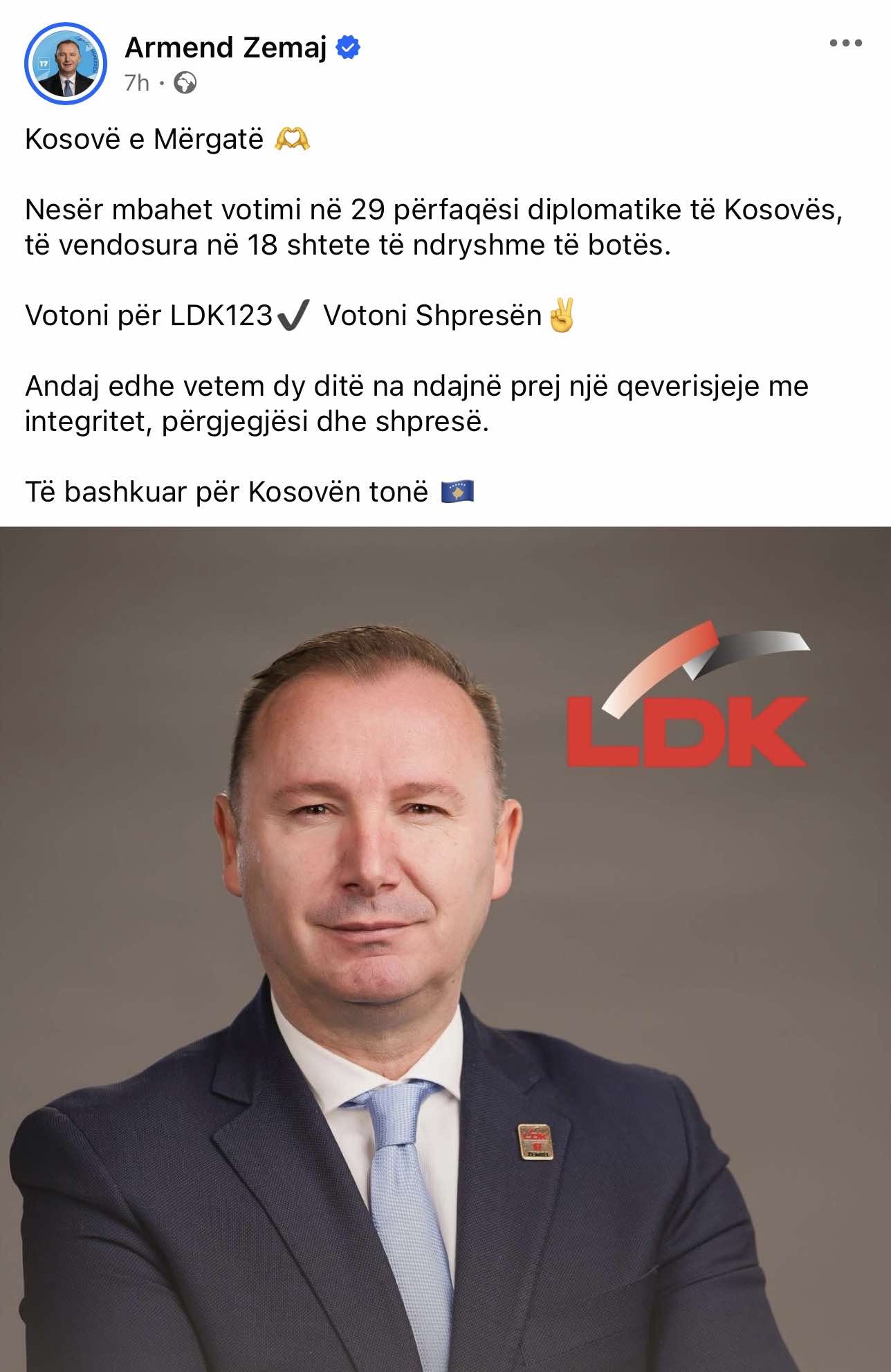 “Nesër mbahet votimi në 29 përfaqësi diplomatike të Kosovës, të vendosura në 18 shtete të ndryshme të botës. Votoni për LDK 123, votoni shpresën. Vetëm dy ditë na ndajnë prej një qeverisjeje me integritet, përgjegjësi dhe shpresë. Të bashkuar për Kosovën tonë,” ka shkruar Zemaj në postimin e tij.