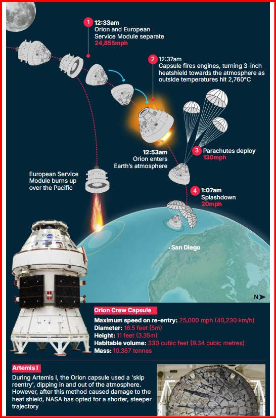 Ekuipazhi – Reid Wiseman, Victor Glover, Christina Koch dhe Jeremy Hansen – më pas do të përballen me rikthim hipersonik në atmosferën e Tokës me shpejtësi 25,000 mph (40,230 km/h).