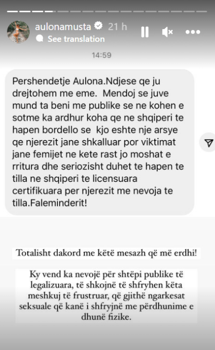 “Totalisht dakord me këtë mesazh që më erdhi! Ky vend ka nevojë për shtëpi publike të legalizuara, të shkojnë të shfryhen këtë meshkuj të frustruar, që gjithë ngarkesat seksuale që kanë, i shfryjnë në përdhunime dhe dhunë fizike”, shkruan Aulona në Instastory.
