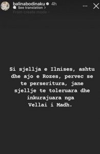 “Si sjellja e Ilnisës, ashtu dhe ajo e Rozës, përveçse të përsëritura, janë sjellje të toleruara dhe inkurajuara nga Vëllai i Madh”, shkruan Balina në postimin e parë.