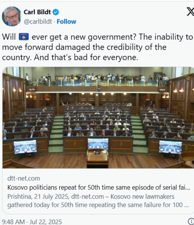 “A do të ketë ndonjëherë Kosova një qeveri të re? Pamundësia për të ecur përpara dëmtoi besueshmërinë e vendit. Dhe kjo është keq për të gjithë”, ka shkruar ai.