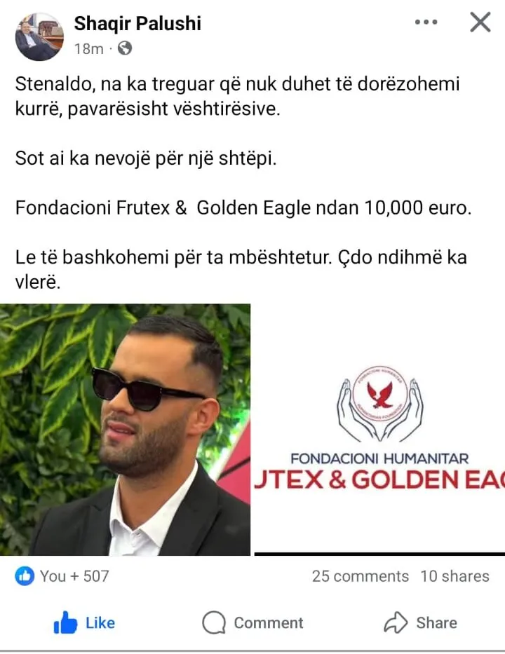 Një gjest i fortë solidariteti ka ardhur së fundmi për ish-banorin e “Big Brother VIP”, Stenaldo, duke rikthyer edhe njëherë në vëmendje fuqinë që ka bashkimi i njerëzve në momente të vështira. Ditën e djeshme, përmes një postimi në rrjetet sociale, biznesmeni Shaqir Palushi bëri të ditur se Fondacioni Humanitar “Frutex & Golden Eagle” ka dhënë një kontribut të konsiderueshëm financiar në mbështetje të tij.