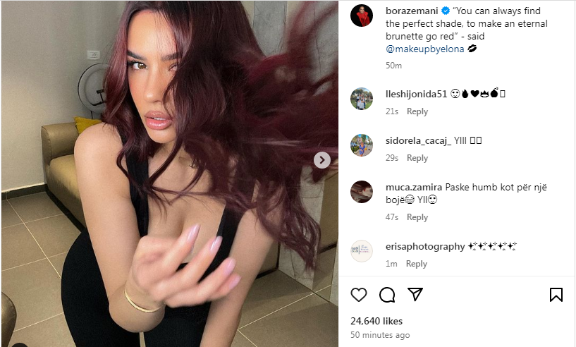 Para pak minutash, ajo ndau me ndjekësit e saj në rrjetin social “Instagram”, disa foto ku tregonte ngjyrën e kuqe në flokët të saj, e cila i shkon shumë.