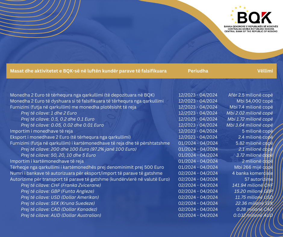 Në periudhën deri në prill 2024, BQK ka arritur disa rezultate të rëndësishme në luftën kundër parave të falsifikuara dhe zbatimin e masave të rregullores për operacione me para të gatshme: