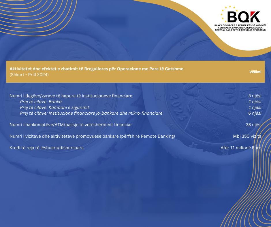 BQK ka organizuar takime ndër-institucionale për këtë qëllim dhe ka zhvilluar aktivitete në përputhje me Planin për Zbatim të Lehtësuar të Rregullores për Operacione me Para të Gatshme.