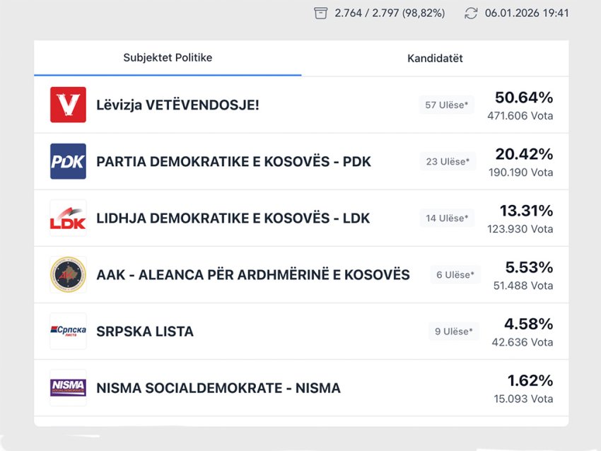 Lajme Rezultatet e pĂ«rmbledhura tĂ« KQZ-sĂ« nĂ« ora 19:41: VetĂ«vendosje 50,64%, PDK 20,42% đ 06.01.2026 đ 0