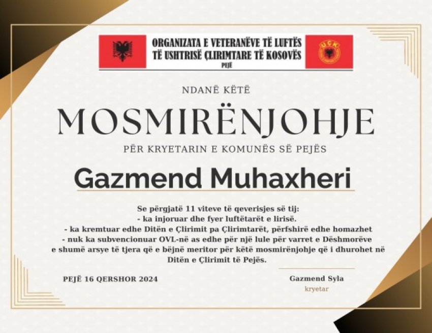 Lajme â11 vjet injorim, OVL UĂK PejĂ« ndan “mosmirĂ«njohje” pĂ«r Gazmend Muhaxherin đ 15.06.2024 đ 1