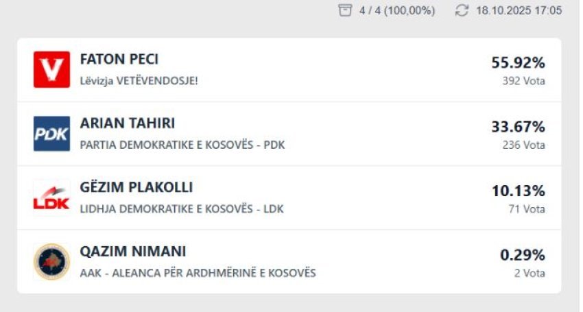 Lajme PĂ«rfundon numĂ«rimi i votave me postĂ« nĂ« MitrovicĂ«, Peci para Arian Tahirit tĂ« PDK-sĂ« đ 18.10.2025 đ 0