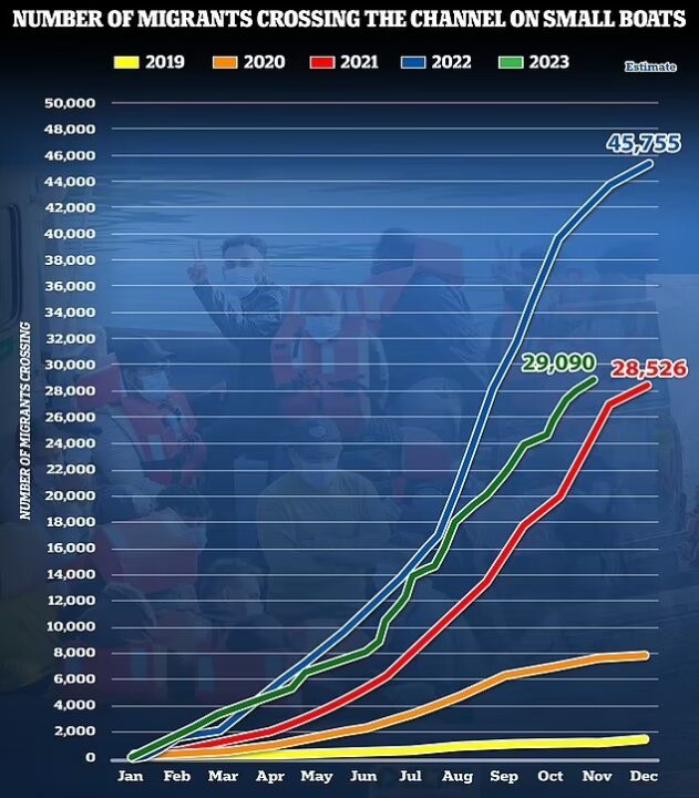 Shifrat u shfaqën sot ndërsa James Cleverly nënshkroi një traktat të ri me Ruandën në një përpjekje për të ringjallur një skemë për të dëbuar emigrantët në vendin e Afrikës Lindore. Sekretari i Brendshëm planifikon të marrë legjislacionin e urgjencës në Commons brenda disa ditësh me shpresën për të filluar fluturimet e dëbimit në pranverë.Vitin e kaluar pa një rekord prej 45,755 azilkërkuesish që mbërritën në Mbretërinë e Bashkuar me varka të vogla, 60 për qind më i lartë se viti 2021, kur 28,526 njerëz bënë udhëtimin e rrezikshëm dhe shifra më e lartë që nga fillimi i mbledhjes së statistikave në 2018.