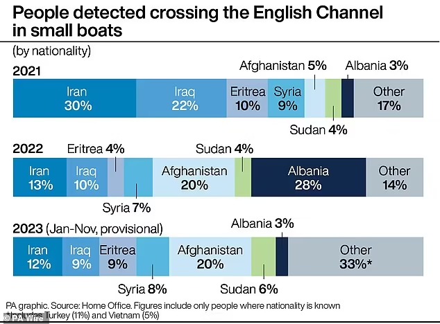 Të dhënat e deritanishme për vitin 2023 sugjerojnë se po shfaqet një prirje e re, me një rënie të mprehtë të të ardhurve shqiptarë dhe një rritje të përqindjes së atyre që janë nga Turqia. Të gjitha shifrat bazohen në numrin total të mbërritjeve ku kombësia është regjistruar nga Home Office.