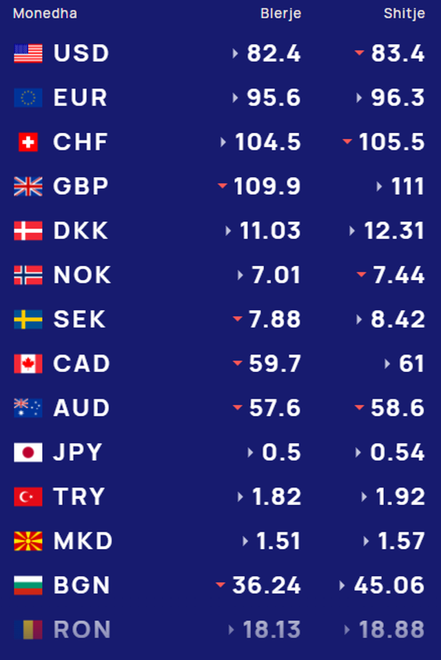 Për kursin e monedhave të tjera shihni tabelën e mëposhtme: