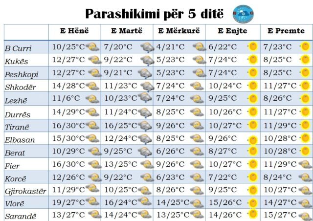Vendi ynë pritet të ketë kushte atmosferike të qëndrueshme e kohëzgjatje me diell për shkak të masave ajrore me origjinë jugore. Pritet një rritje graduale e temperaturave të mesditës 28-30°C.
