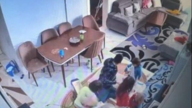 Në pamje shihet teksa 34-vjeçari po luan me vajzat, dhe sipas TCH, pas këtij momenti, Mandri çohet dhe dhunon bashkëshorten në sy të fëmijëve të mitur.