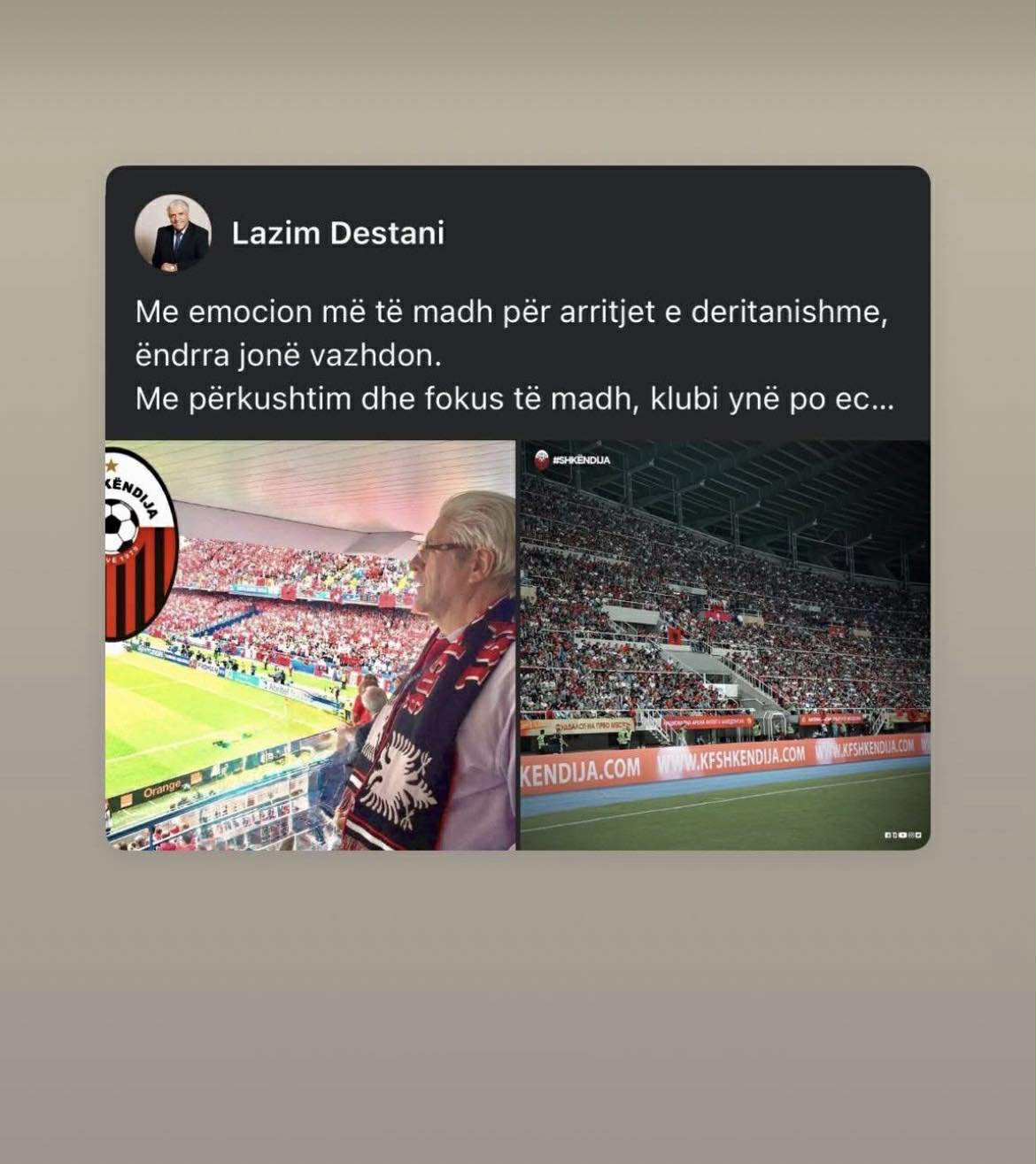Sot do të jemi të gjithë në tribunat e stadiumit, duke kënduar këngët tona të fitores dhe duke i dhënë zemër lojtarëve dhe stafit tonë, sepse ata e meritojnë këtë.