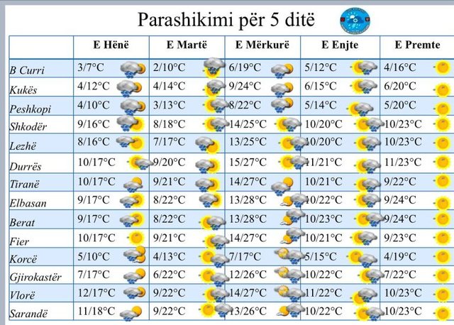 Ditën e Premte moti do të jetë i kthjellët me kohëzgjatje të orëve me diell. Vlen të theksohet rritje tejet e theksuar e temperaturave ditën e Mërkurë në të dyja vlerat për shkak të depërtimit të një mase të ngrohtë me origjinë nga Afrika e Veriut si dhe erës jugore.