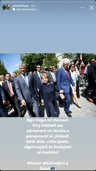 Endrit Thaçi ka shkruar se shpreson që në vitin tjetër të festoj bashkë me ish-presidentin Thaçi për Ditën e Çlirimit.