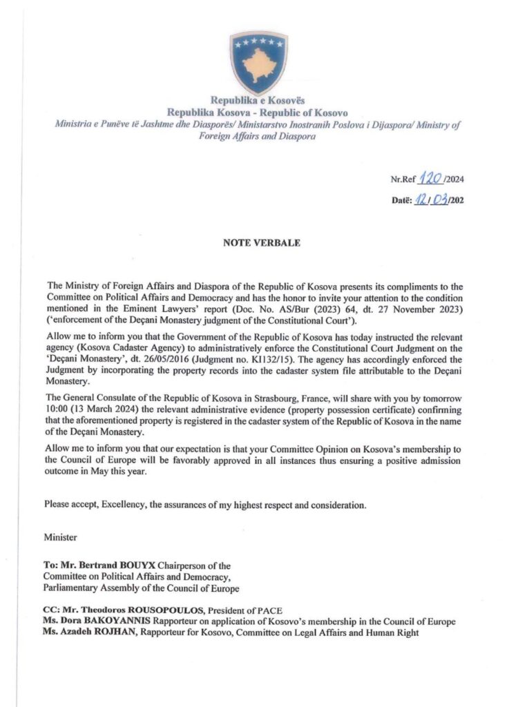 Gërvalla në shkresën e saj ka thënë se institucionet e Kosovës do të vënë në dispozicion të Këshillit të Evropës edhe certifikatën për posedimin e pronës , ku konfirmohet regjistrimi në emër të Manastirit të Deçanit.