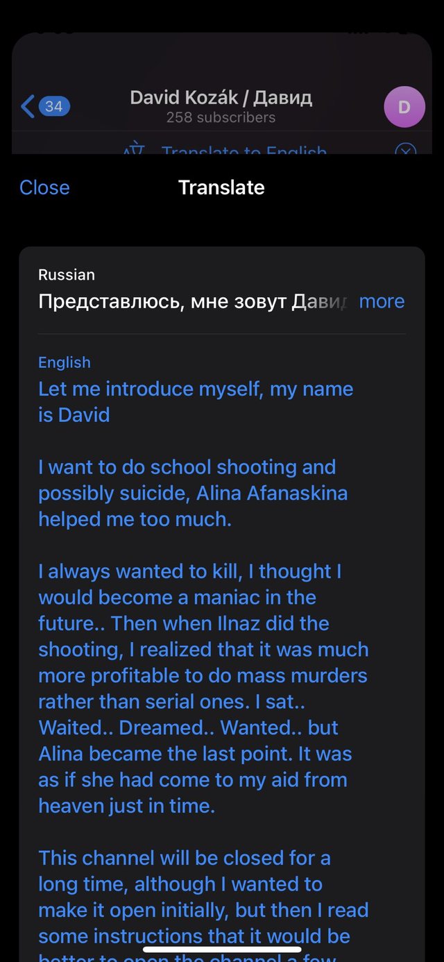 “Më lejoni të prezantoj veten time. Unë jam Davidi. Dua të bëj vrasje në shkollë, dhe mundësisht vetëvrasje. Alina Afanaskina më ka ndihmuar shumë. Gjithmonë kam dashur të kryej vrasje, mendoja se do të bëhesha një maniak në të ardhmen. Më pas kur Ilnas qëlloi, kuptova se ishte më shumë e vlefshme të bëja vrasje masive sesa vrasje seriale. Unë u ula… prita… ëndërrova… desha… por Alina u në pika ime e fundit. Ishte sikur ajo erdhi në ndihmë për mua nga parajsa në kohën e duhur”, shkruan autori.