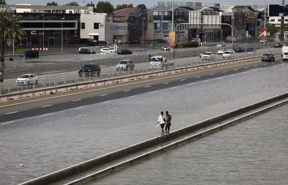 Njerëzit ecin nëpër një barrierë rrugore ndërsa hapësira përreth është mbuluar nga uji i përmbytjeve të shkaktuara nga reshjet e dendura në Dubai.