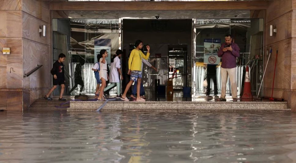 Banorët e një ndërtese qëndrojnë para hyrjes, shkallët e së cilës janë pothuajse të mbuluara nga uji si pasojë e përmbytjeve, në Dubai.
