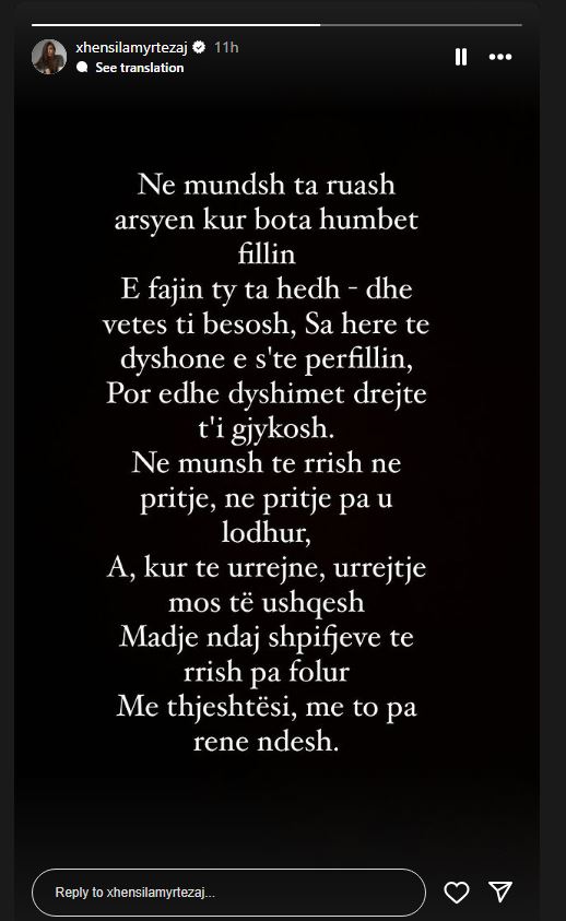 Mbrëmjen e sotme, Xhensila ka bërë një postim në profilin e saj të Instagramit, një poezi të Rudyard Kipling, të titulluar ” Në mundesh”.