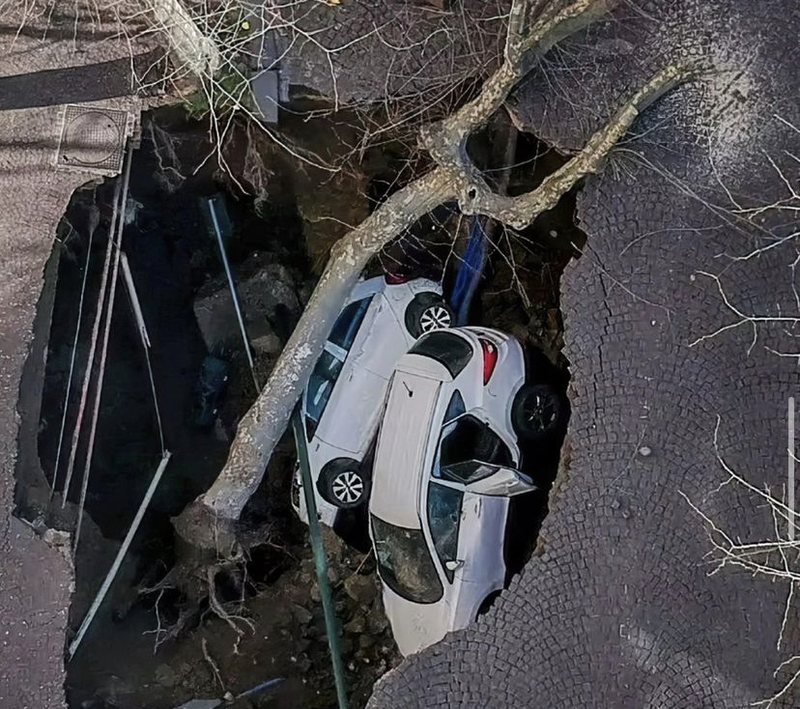 Një gropë e madhe është hapur e cila ka gëlltitur dy makina në brendësi të saj.