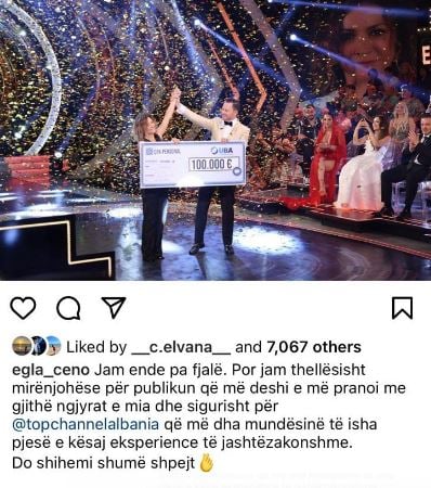 Egla Ceno ka reaguar për herë të parë në rrjetet sociale, ku ka publikuar një foto në momentin që ka marrë në dorë çekun prej 100 mijë eurosh.