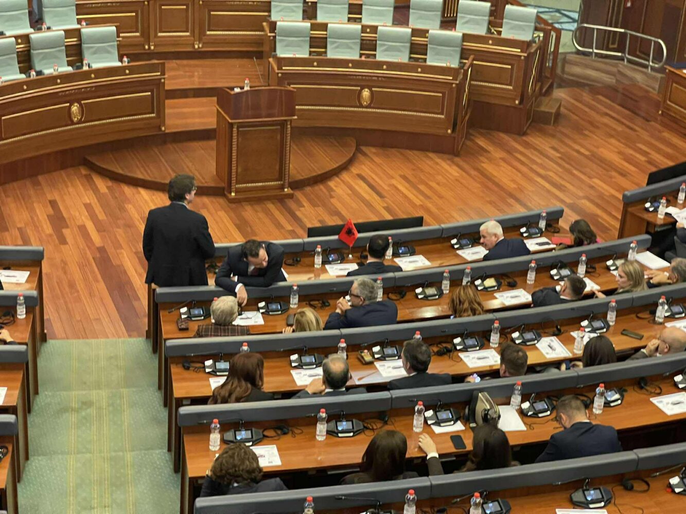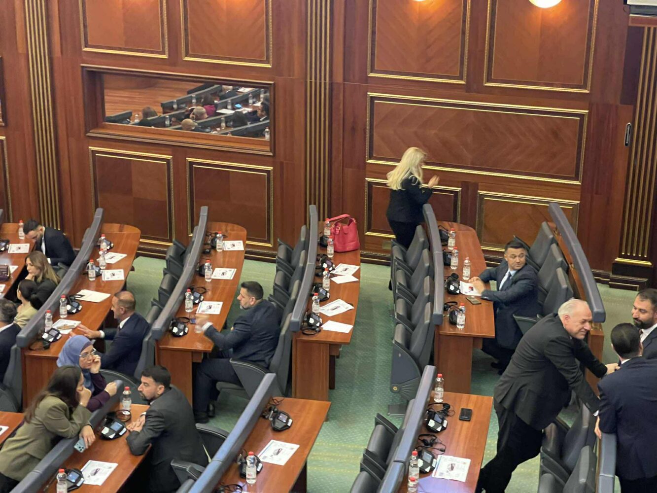 Ndërkohë që në sallë mungon vet mandatari për kryeministër nga radhët e Vetëvendosje, Albin Kurti. Por ajo që bie në sy, është se në sallën e Kuvendit nuk është as kryetari i NISMA-s Socialdemokrate, Fatmir Limaj.