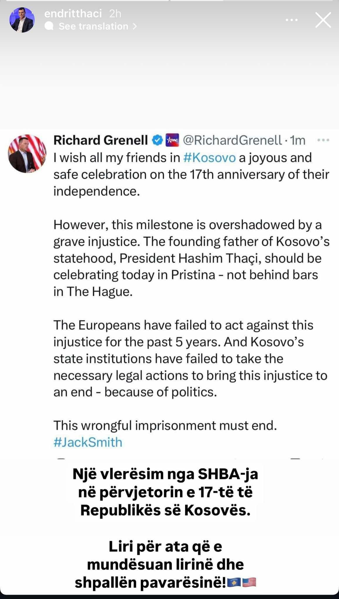 Grenell ka shkruar: ”…ky moment historik është lënë në hije nga një padrejtësi e rëndë. Babai themelues i shtetësisë së Kosovës, presidenti Hashim Thaçi, duhet të festojë sot në Prishtinë – jo pas hekurave në Hagë”