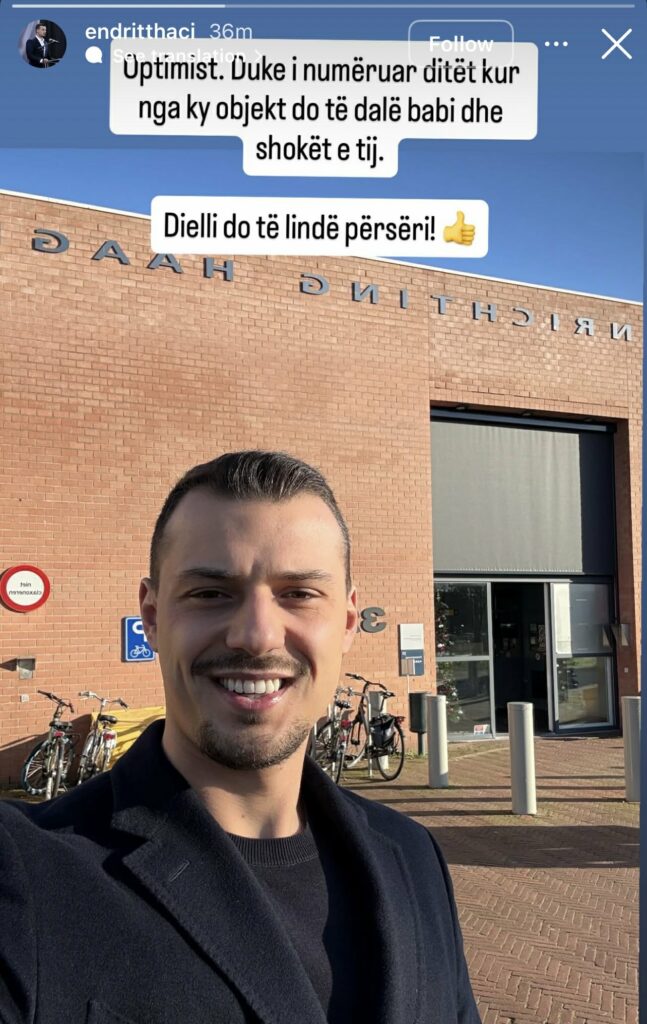 “Optimist. Duke i numëruar ditët kur nga ky objekt do të dalë babi me shokët e tij. Dielli do të lindë përsëri”, ka shkruar ai, duke bashkëngjitur një emoji me gishtin lart, njësoj si bënte gjithmonë ish-presidenti Thaçi.
