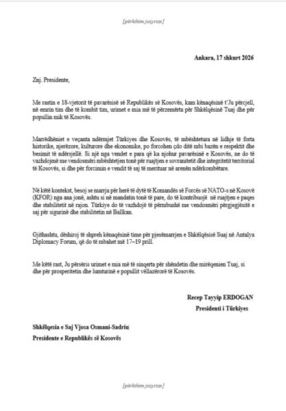 “Presidenti i Turqisë, Recep Tayyip Erdoğan, uron Presidenten Vjosa Osmani për Ditën e Pavarësisë së Kosovës Presidentja e Republikës së Kosovës, Vjosa Osmani, ka pranuar letër urimi nga Presidenti i Republikës së Tuqisë, Recep Tayyip Erdoğan, me rastin e 18-vjetorit të Pavarësisë. Në mesazhin e tij, Presidenti Erdoğan ka riafirmuar mbështetja e vazhdueshme e Tuqisë për sovranitetin dhe integritetin territorial të Kosovës, si dhe për avancimin e pozitës së saj në arenën ndërkombëtare. Presidenti Erdoğan po ashtu thekson angazhimin e vendit të tij për paqe dhe stabilitet në rajon”, thuhet në njoftim.