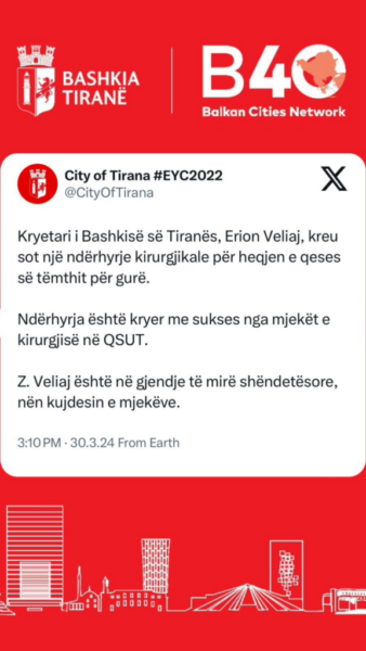 “Kryetari i Bashkisë së Tiranës, Erion Veliaj, kreu sot një ndërhyrje kirurgjikale për heqjen e qeses së tëmthit për gurë. Ndërhyrja është kryer me sukses nga mjekët e kirurgjisë në QSUT. Z. Veliaj është në gjendje të mirë shëndetësore, nën kujdesin e mjekëve”, shkruhet në njoftimin e Bashkisë Tiranë.