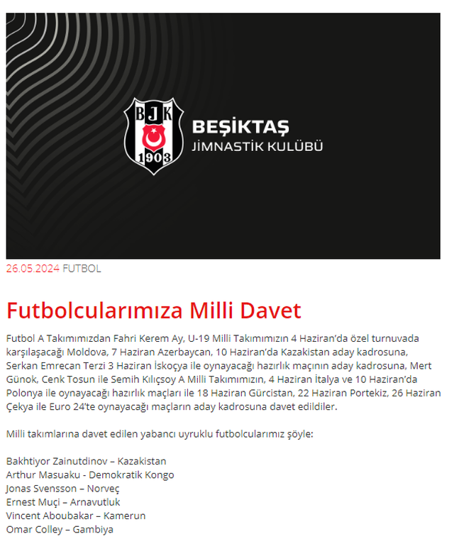 Në faqen zyrtare, klubi nga Stambolli ka treguar listën e lojtarëve që janë të grumbulluar nga kombëtaret e tyre, mes tyre edhe Muçin.