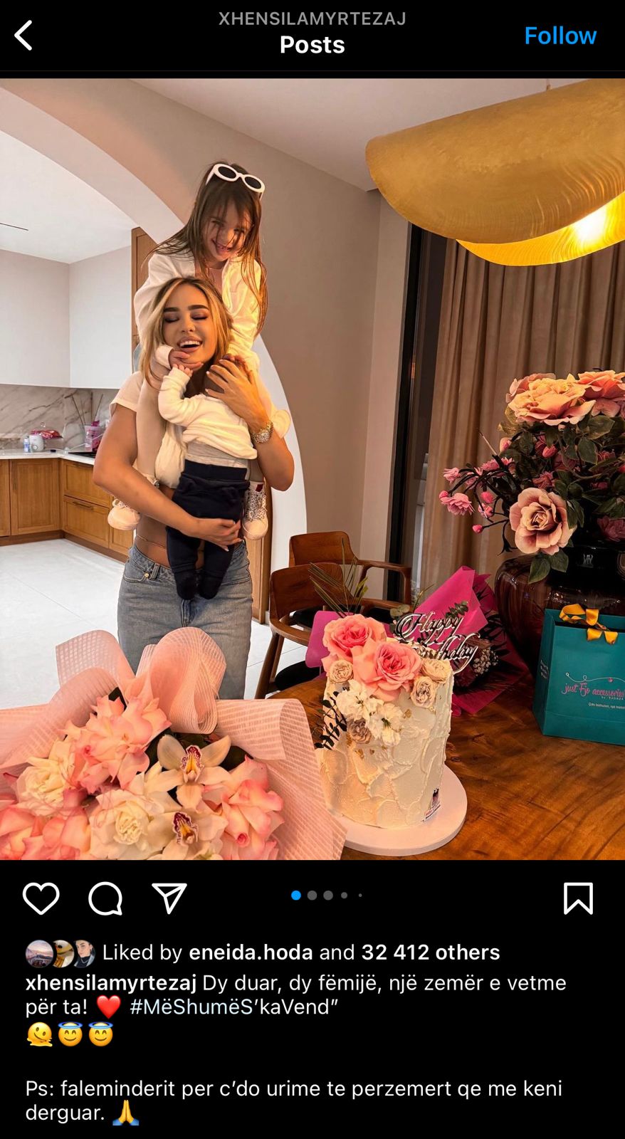 Kanë qenë miqtë e shumtë të këngëtares dhe shumë fansa që e kanë uruar në rrjetin social Instagram duke postuar foto dhe duke i dhuruar lule. Para disa minutash ajo ka postuar disa foto dhe video në një carosel ku i ka falenderuar të gjithë për urimet, por ajo që mori vëmendjen ishte edhe ‘caption’-i që ajo kishte shkruar: