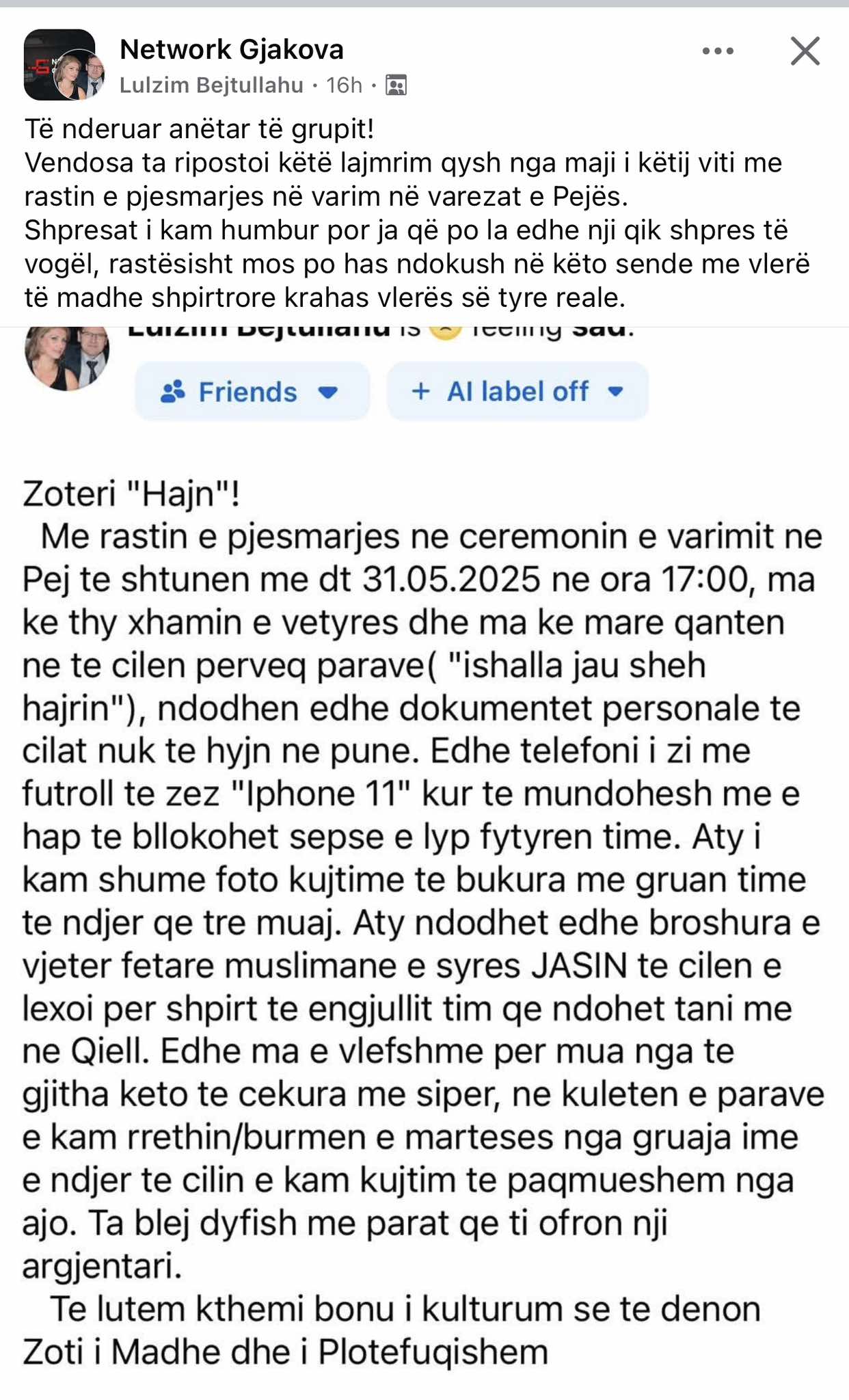 Një qytetar i Gjakovës, viktimë e një vjedhjeje, i është drejtuar me shumë qetësi dhe mirësi personit që i ka thyer veturën, duke i kërkuar të kthejë vetëm një send me shumë rëndësi për të: portofolin.