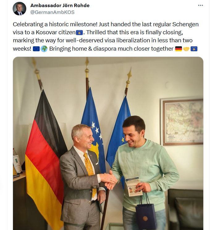 Ai këtë e ka cilësuar si moment historik. “Duke festuar një moment historik! Sapo i dorëzova vizën e fundit të rregullt Shengen një shtetasi kosovar. Të emocionuar që kjo epokë po mbyllet më në fund, duke i dhënë rrugë liberalizimit të merituar të vizave në më pak se dy javë! Duke sjellë shtëpinë dhe diasporën shumë më afër së bashku”, ka shkruar diplomati gjerman.