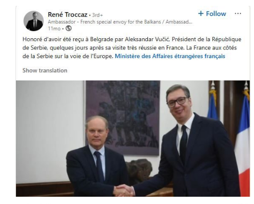 “I nderuar që u prita në Beograd nga Aleksandar Vuçiq, president i Serbisë, pak ditë pas vizitës së tij të suksesshme në Francë. Franca qëndron përkrah Serbisë në rrugën drejt Evropës”, shkruante ai në rrjetin social LinkedIn.