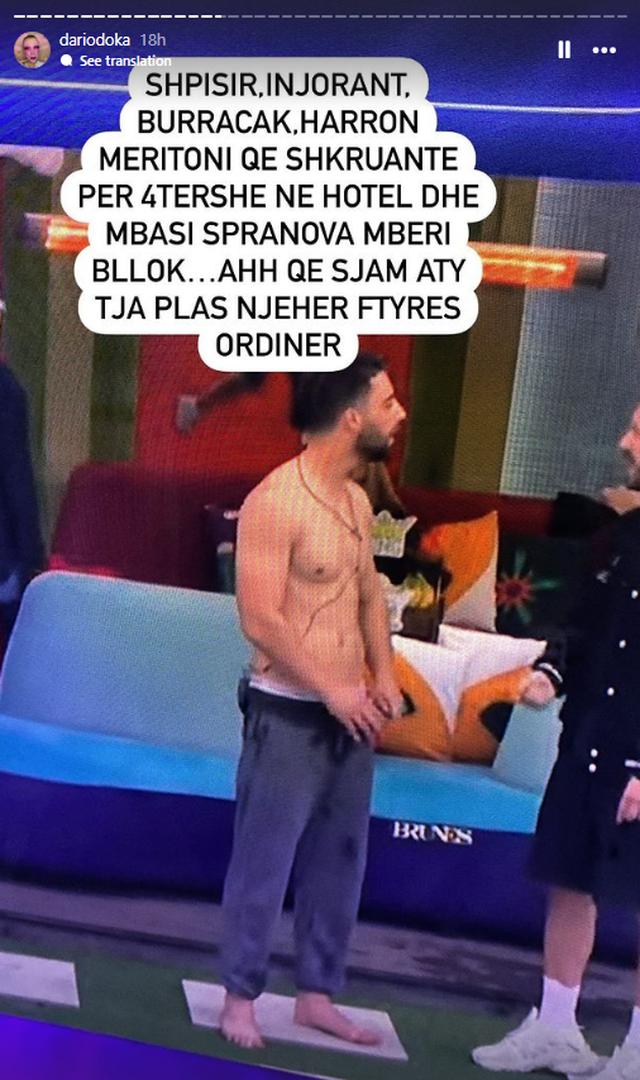 “Shpifsirë, injorant, burracak. Harron Meritoni që shkruante për 4-she në hotel, dhe pasi nuk pranova më bëri bllok…ahh që s’jam aty t’ia plas njëherë fytyrës ordiner”, shkruan Dario ndër të tjera në Instagramin e tij.