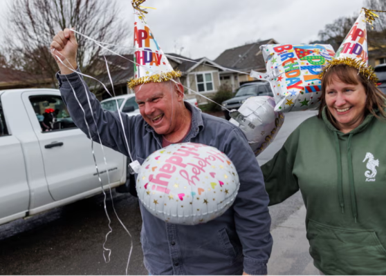 Kështu të dielën e kaluar nisi parakalimi me 15 qen, zjarrfikësja, shërbimi i pastrimit të bashkisë dhe një kortezh makinash të dekoruara me tullumbace. Tre kitaristë kanë luajtur muzikë dhe disa fëmijë kanë mbushur me lule të pranishmit.