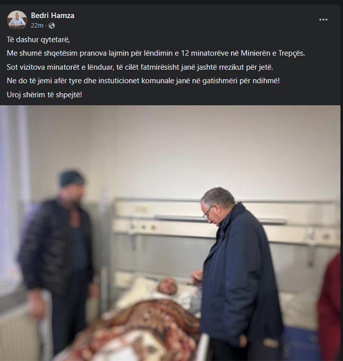 Sot 12 minatorë janë lënduar në minierën e Trepçës, ku dy prej tyre janë në gjendje të rëndë shëndetësore. Kryetari i Komunës së Mitrovicës së Jugut, Bedri Hamza, ka shkuar për vizitë tek të lënduarit në spital.