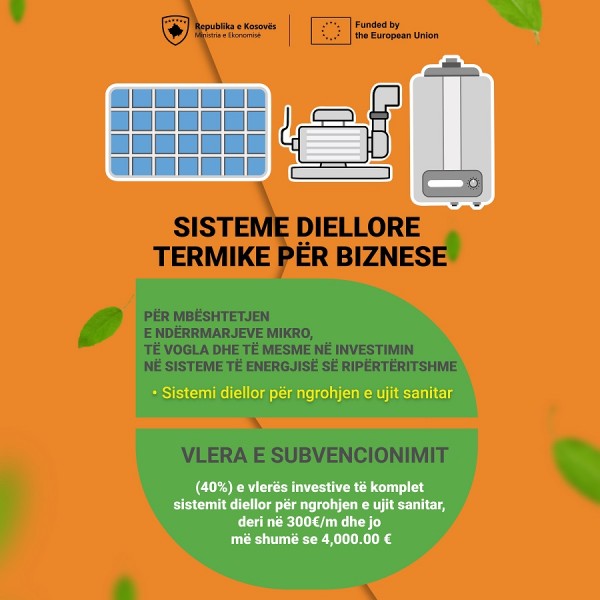 Instalimi i sistemit diellor për ngrohjen e ujit sanitar subvencionohet 40% e vlerës investive të komplet sistemit diellor për ngrohjen e ujit sanitar, deri në 300€/m² dhe jo më shumë se 4,000 euro.