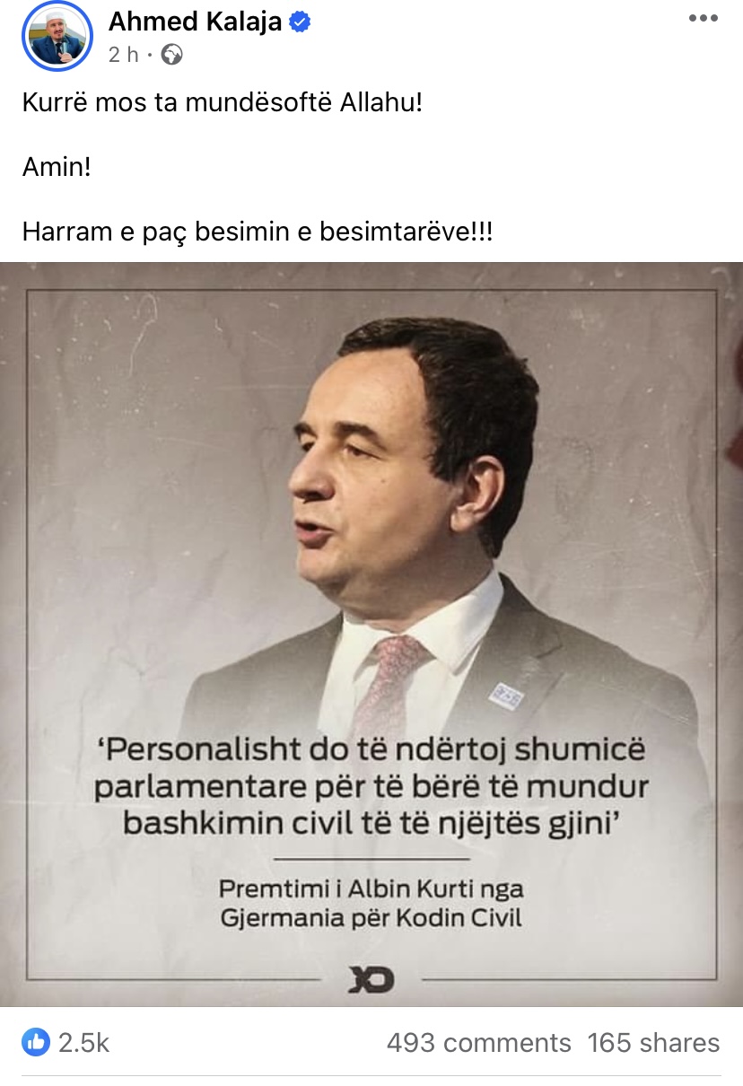 “Kurrë mos ta mundësoftë Allahu!Amin!Harram e paç besimin e besimtarëve”, shkroi ai.